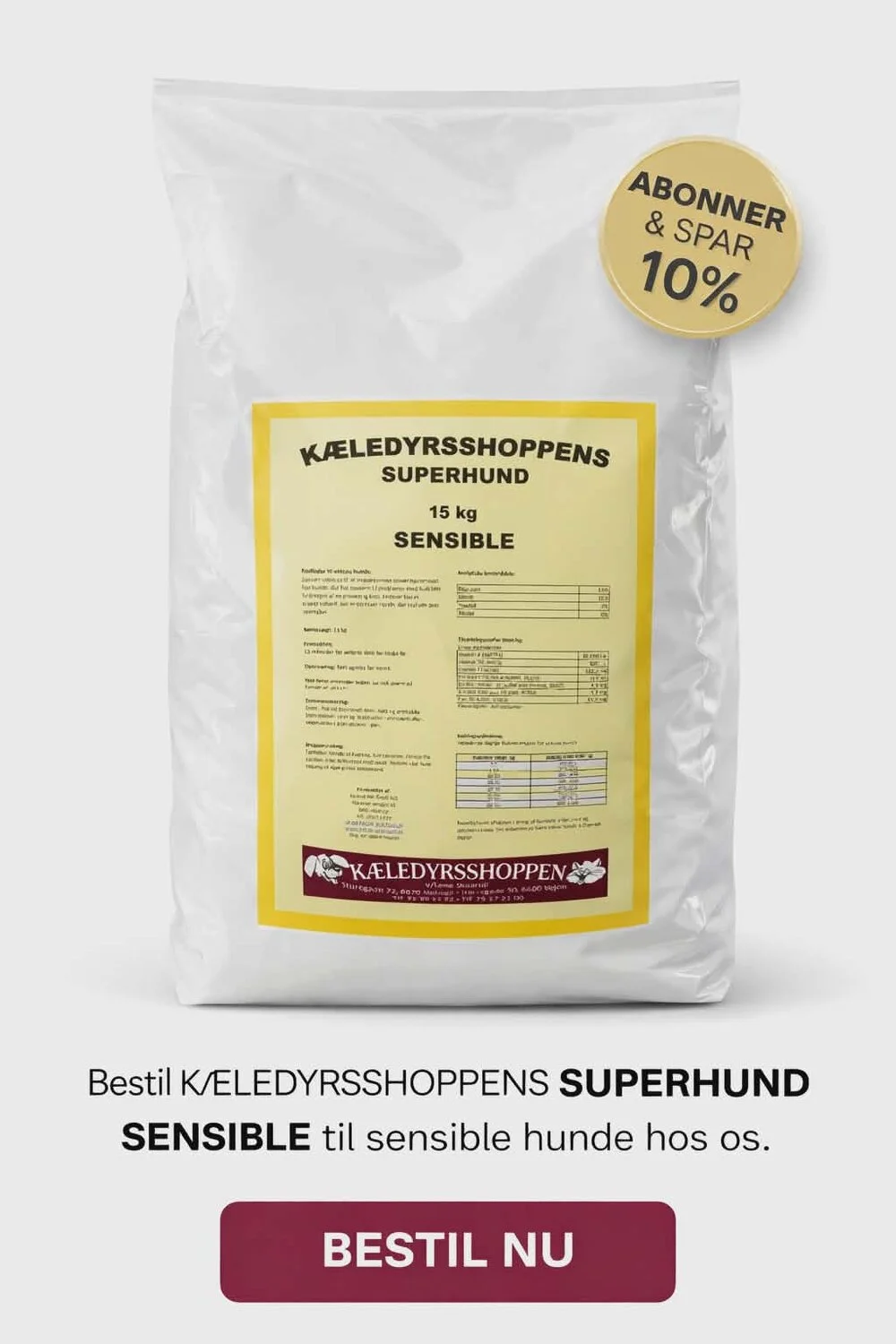 Vil du aldrig løbe tør for foder? Vælg vores abonnementsmulighed og få Sensible 15 kg leveret automatisk hver måned.