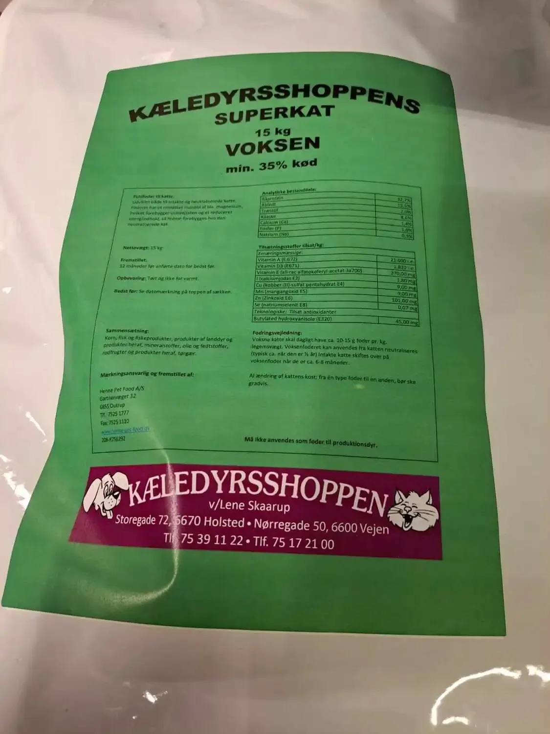 Ris, majs, frisk laks, fjerkræmel, fiskemel, svinefedt, blodmel, vitamin/mineralblanding, tørrede sukkerroesnitter, tørrede æg, ølgær, rapsolie og lecithin.
