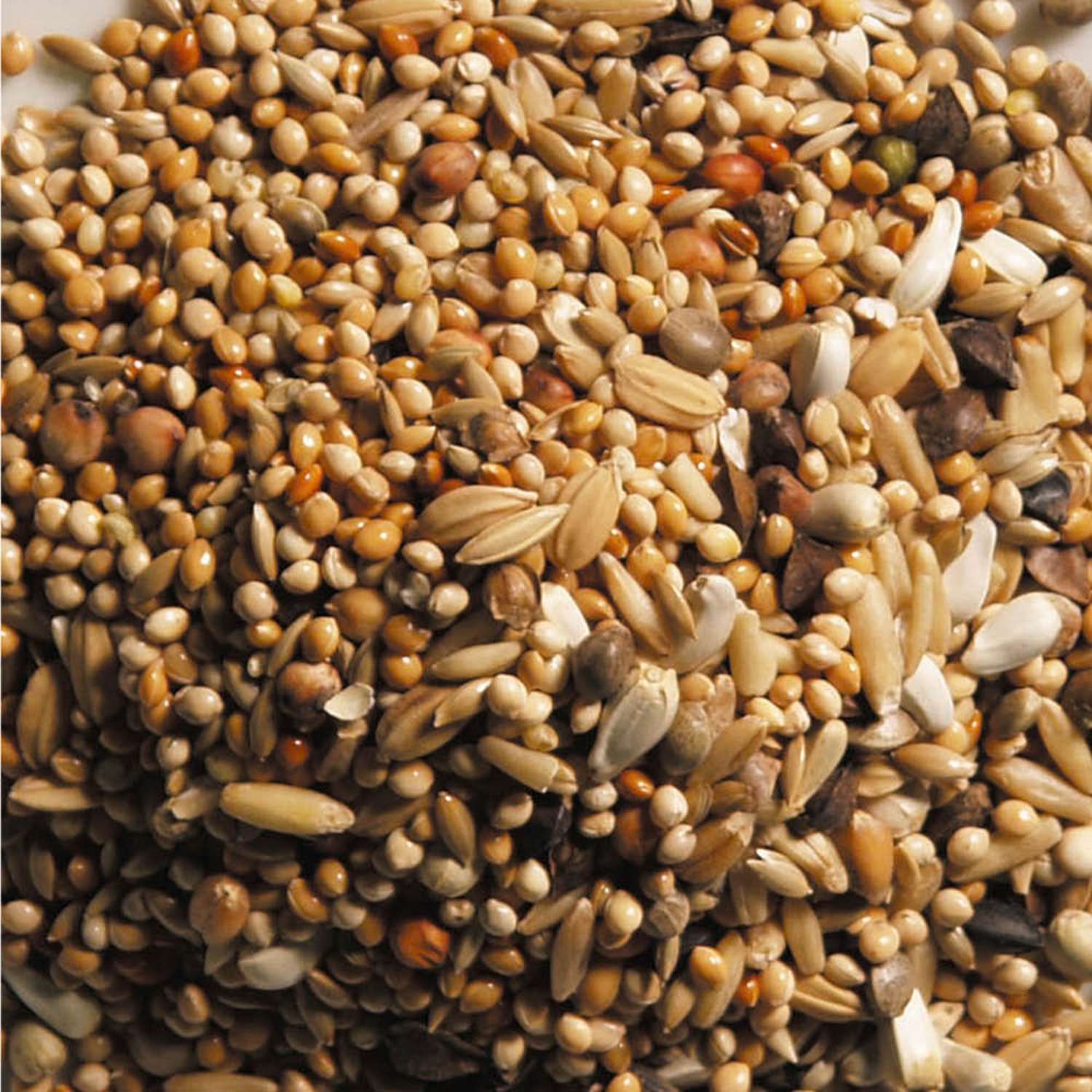| Gul hirse, hvid hirse, kanariefrø, afskallet havre, rød hirse, cardi, hvede, milo, boghvede, paddyris, hamp. |